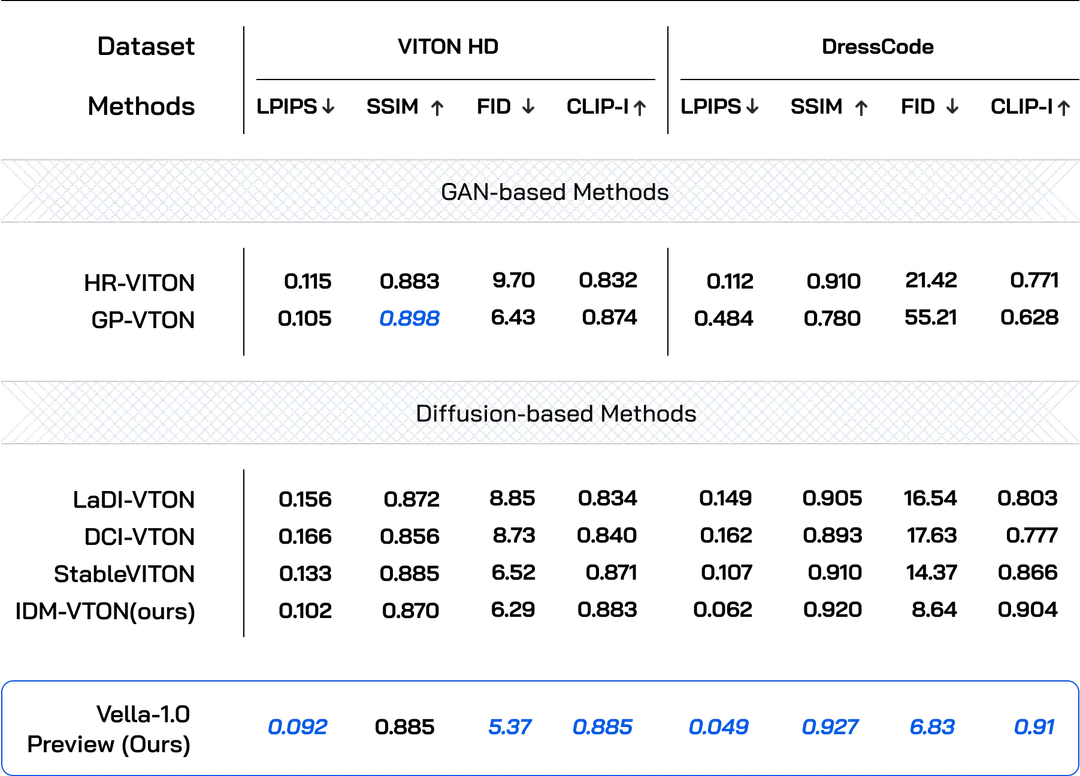 Our tests reveal that Vella-1.0 Preview has superior performance on both the VITON-HD and DressCode datasets. The model outperforms other concurrent methods across diverse metrics, showcasing its versatility and robustness.