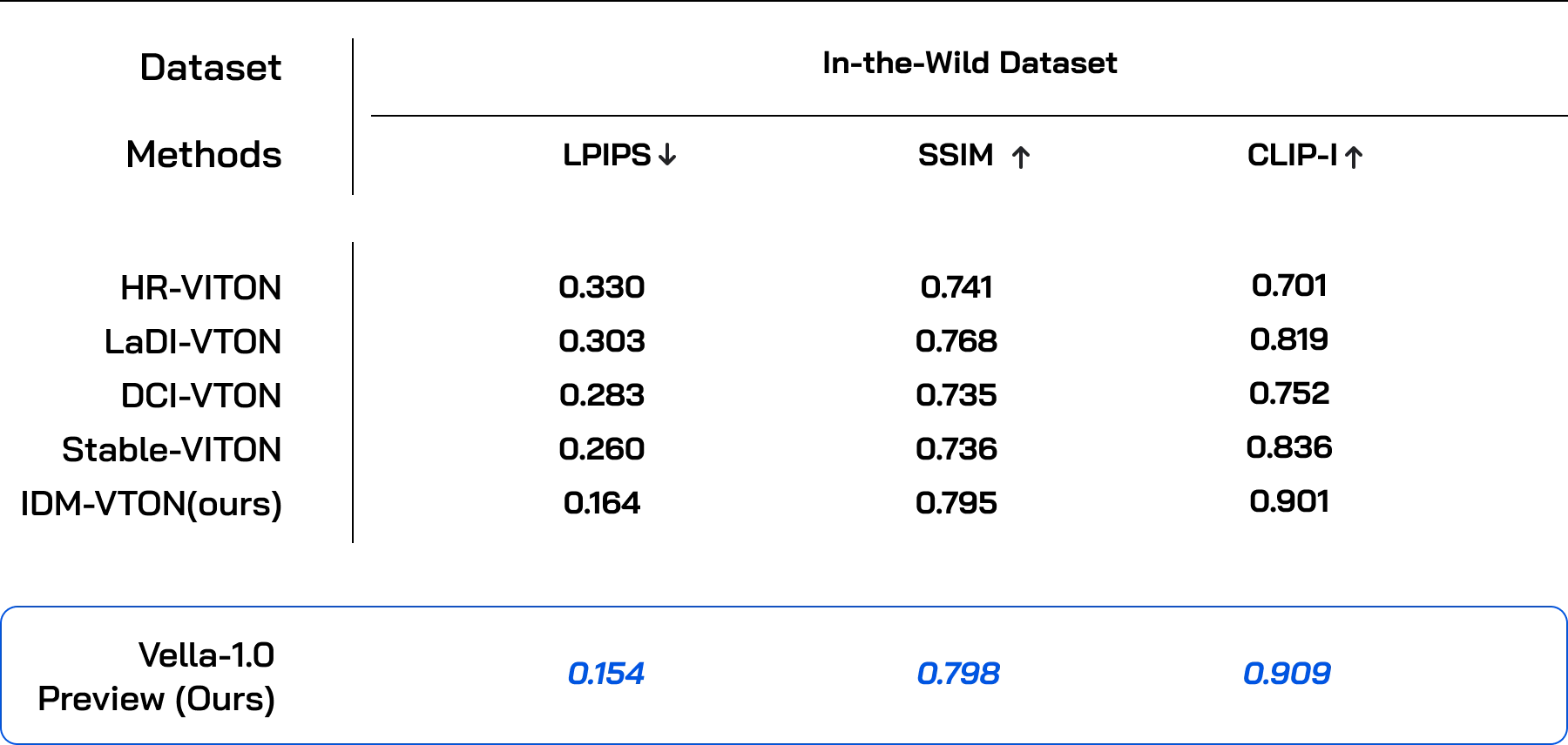 To showcase Vella-1.0 Preview's capabilities in real-world applications, we've conducted tests in diverse and challenging scenarios. Using the In-the-Wild dataset, we compared Vella-1.0 Preview with other diffusion-based VTON (Virtual Try-On) methods. The results showed that Vella-1.0 Preview outperforms other methods across all metrics, even surpassing the performance of IDM-VTON.