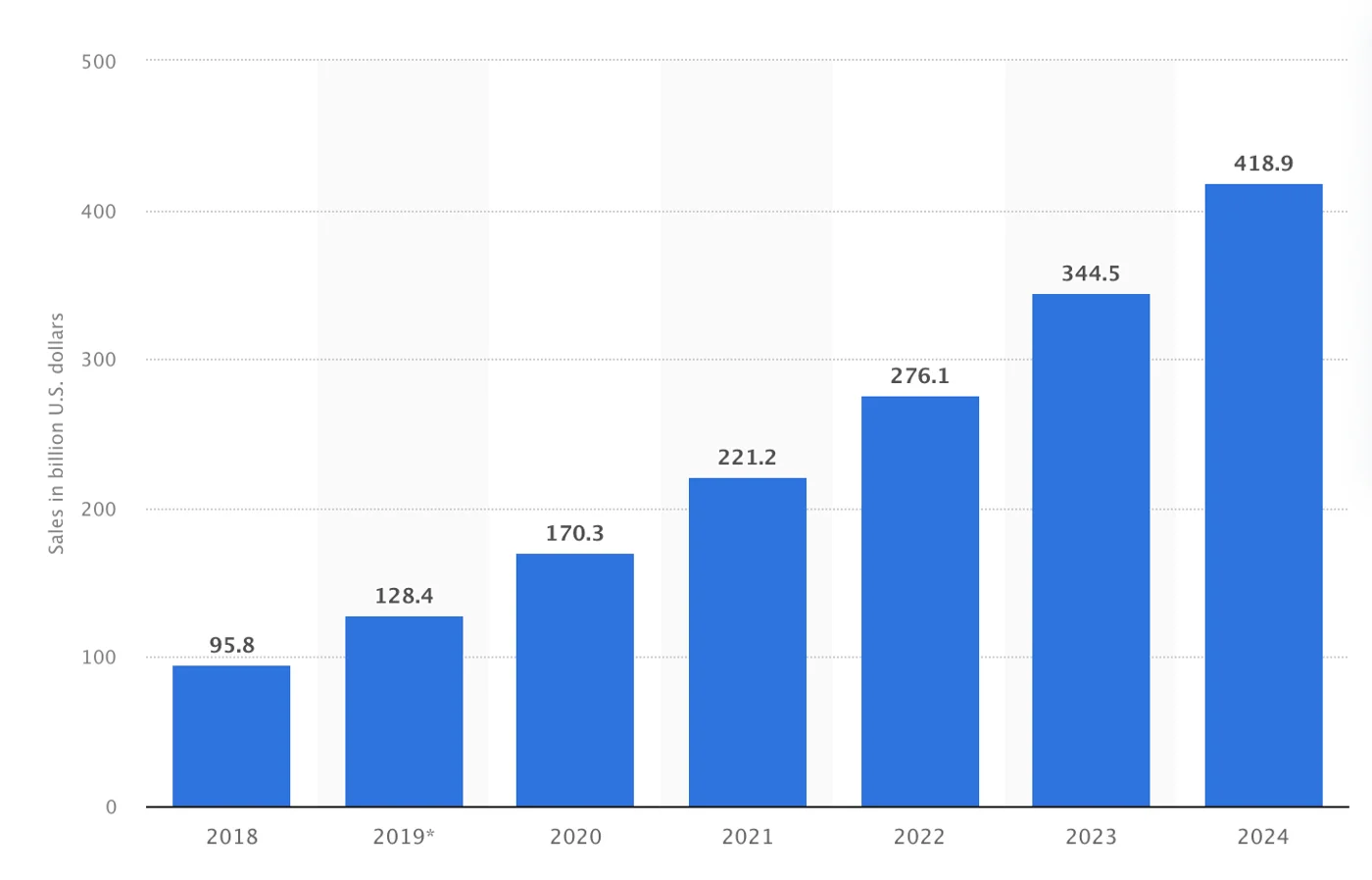 Figure 1: Retail m-commerce sales via smartphone in the United States from 2018 to 2024 (in billion U.S. dollars)